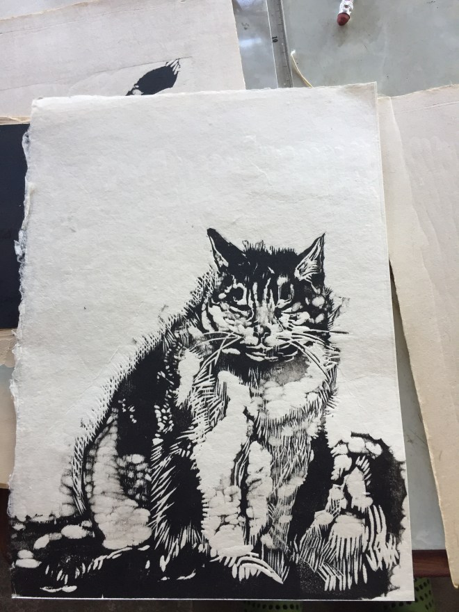 こちらの表装専門店は個人を対象にしたお店でとても助かります。店内はこじんまりとしつつも整頓されていて、和紙に印刷したサンプルも見せていただき、可能性を感じワクワクしちゃいました。今回は和紙に印刷した絵の上から版画を刷ろうと考えていて、うまくいけばいいのですが。
