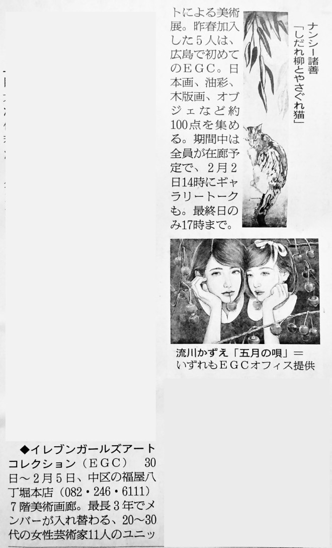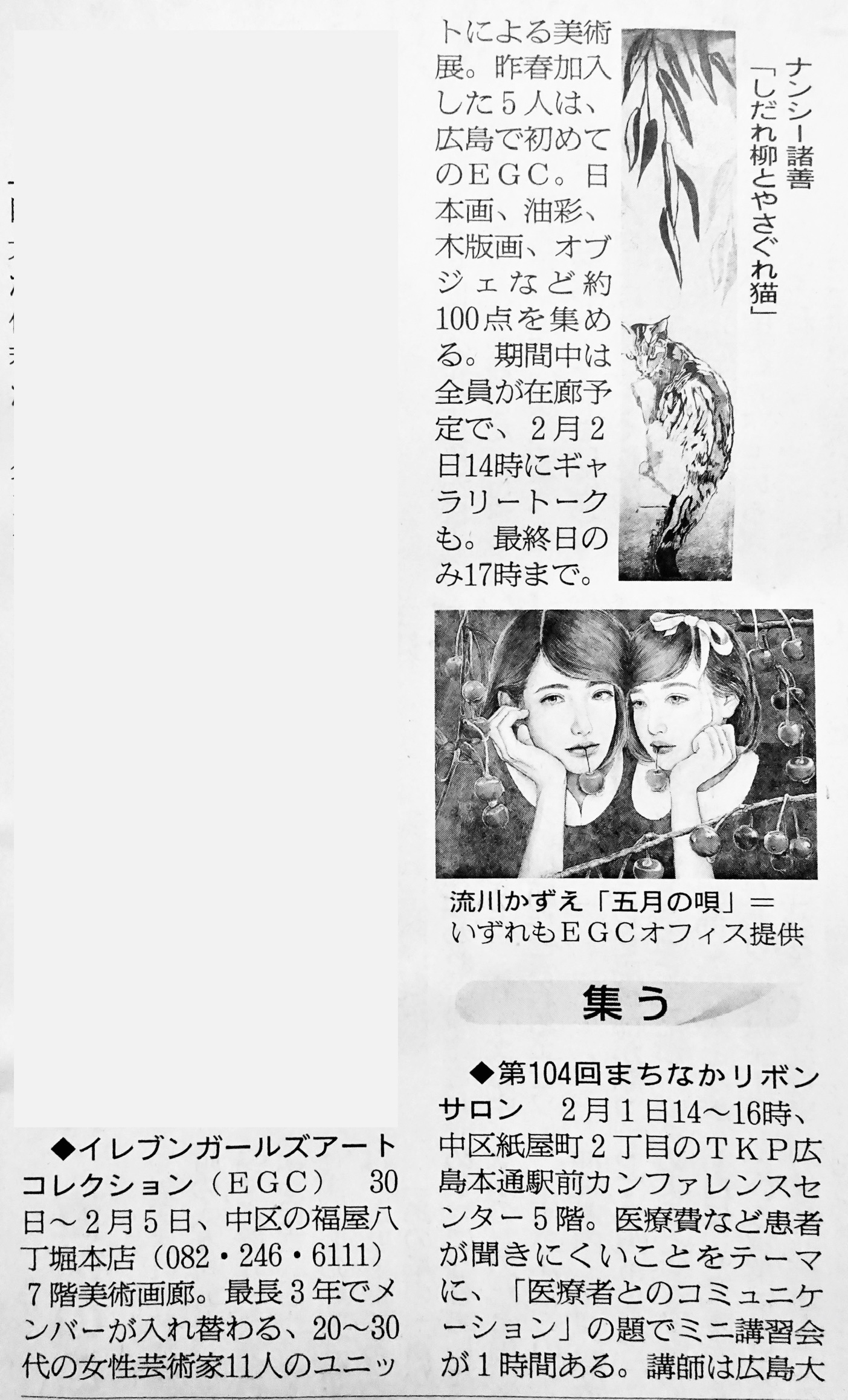 広島の1月17日(金)朝日新聞朝刊の記事にEGC展を 紹介していただきました! しかも、作品を載せてもらえた\( ˆoˆ )/ 実は誕生日なんですよお。最高のプレゼントです~!