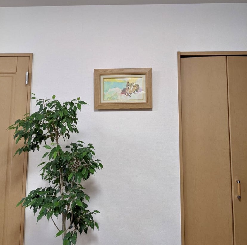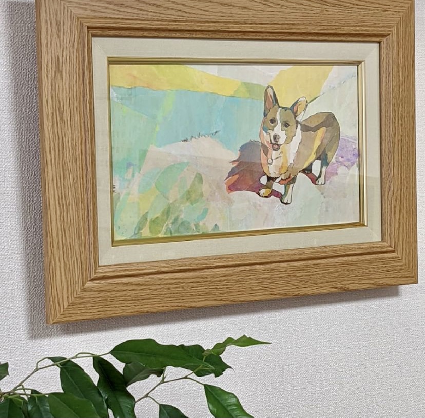 はじめて、犬関係の絵を描いてとても紆余曲折した作品です。最初はいつものように木版画でモノクロの作品の予定だったんですが、モデルのワンちゃんの性格やコーギー犬そのものの気質を取材したところカラフルな作調となりました。
